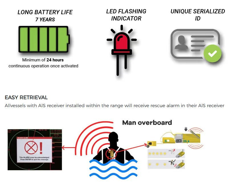 Deze betrouwbare noodzender is de perfecte aanvulling voor uw zwemvest. Als u onverwacht te water raakt zal dit noodbaken een signaal uitzenden dat direct een melding geeft bij alle schepen in de nabije omgeving uitgerust met AIS.